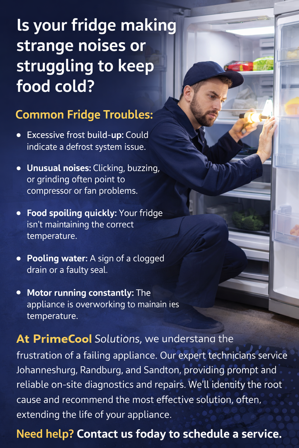 Affordable On-Site Fridge & Appliance Repairs with 3-Month Warranty — Same-Day Service in Randburg, Sandton & Roodepoort. PrimeCool Solutions provides fast, affordable, professional appliance repairs with transparent pricing and a 3-month workmanship warranty. Since 2020, we've helped hundreds of families avoid costly replacements. ✅ We Repair: Fridges • Freezers • Washing Machines • Dryers • Dishwashers • Ovens • Stoves • Microwaves • Ice Makers • Installation • Diagnostics • Emergency On-Site Repairs ✅ Major Brands: Samsung • LG • Defy • Bosch • Hisense • Whirlpool • KIC • Siemens • Snowmaster and Kelvinator amongst others. Servicing: Randburg, Sandton, Roodepoort, Rosebank and surroundings Call Now for Same-Day Diagnosis & Quote.